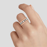 The 2-tone Delight ring is lining the white gold infinite Heart&Diamonds insignia with a high-polished rose gold perle-chain on each side that make the ring incredibly comfortable to wear and give it a strong yet lovely appearance.